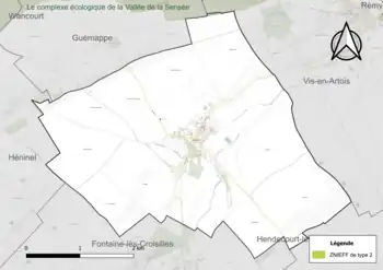 Le territoire communal comprend une ZNIEFF de type 2[Note 2] : le complexe écologique de la vallée de la Sensée. Cette ZNIEFF de la vallée de la Sensée s’étend sur plus de 20 kilomètres depuis les communes de Remy et Haucourt jusqu’à la confluence de la rivière canalisée avec l’Escaut. Elle forme une longue dépression à fond tourbeux, creusée entre des plateaux aux larges ondulations ; Ostrevent au Nord, bas-Artois au Sud et Cambrésis à l’Est[12].