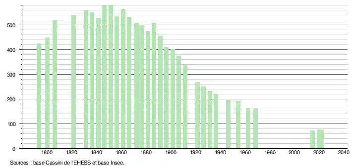 L'évolution du nombre d'habitants est connue à travers les recensements de la population effectués dans la commune depuis 1793. Pour les communes de moins de 10 000 habitants, une enquête de recensement portant sur toute la population est réalisée tous les cinq ans, les populations légales des années intermédiaires étant quant à elles estimées par interpolation ou extrapolation[9]. Pour la commune, le premier recensement exhaustif entrant dans le cadre du nouveau dispositif a été réalisé en 2004[10].