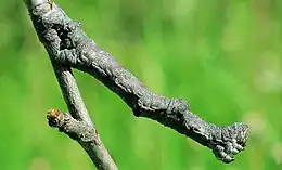 Sur une tige de chêne, l'unité de croissance portant des bourgeons et des cicatrices foliaires, débute par la cicatrice de cataphylles en anneau (à droite).
