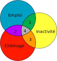 De même, on trouve des situations intermédiaires entre l’emploi et l’inactivité (cf. zone 1), situation occupée par les individus faisant le choix de travailler moins. Enfin, les travailleurs clandestins et les employés « au noir » ne sont pris en compte dans aucun des trois groupes (cf. zone 4).