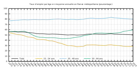 Selon l'Office statistique des Communautés européennes Eurostat, avec un taux d'emploi de 38,1 % pour les 55-64 ans en 2006, la France reste très en dessous de la moyenne de l’Union européenne (UE) (43,5 %). Un objectif de 50 % en 2010 a été fixé par l'UE[41], qui a également a listé les voies d'amélioration[42].