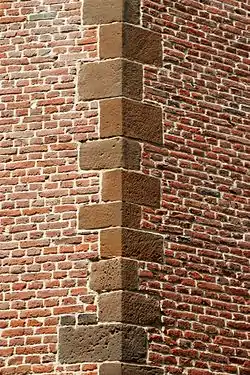 Partie en appareil formant l'angle saillant de la jonction de deux murs, l'encoignure de murs qui lie les corps de bâtiments et certains des avant-corps dans les constructions maçonnées. Ces parties peuvent être constituées en moellons ou en pierre de taille, pendant que les pans sont constitués d'un autre matériau moins coûteux. La chaîne des blocs pleins maçonnés peut être renforcée par des agrafes. Le chaînage des briques et blocs alvéolaires se fait en introduisant verticalement des fers à béton dans les alvéoles des éléments d'angle et en les liant par un mortier.