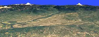 Le relief de la chaîne des Cascades scinde la région en deux zones géographiques distinctes : à l'est, l'Eastern Washington où s'étendent de hauts plateaux arides[12] formés il y a 16 millions d'années par de gigantesques coulées de laves[13] où le fleuve Columbia et ses principaux affluents, les rivières Snake, Yakima et Okanagan, ont sculpté d'impressionnants canyons[14] ; à l'ouest, la chaîne domine la plaine dépressionnaire du Puget Sound et les chaînes côtières de l'Oregon et des montagnes Olympiques.