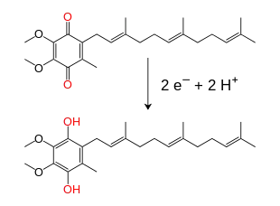 Dans la membrane mitochondriale interne, les électrons sont transportés par des ubiquinones, dont la forme principale chez les mammifères est la coenzyme Q10. Celle-ci est un transporteur d'électrons et de protons liposoluble faisant intervenir un cycle rédox[3]. Cette petite benzoquinone est très hydrophobe, ce qui lui permet de diffuser à l'intérieur de la membrane. Lorsque la coenzyme Q10 accepte deux électrons et deux protons, elle donne un ubiquinol Q10H2, qui en est la forme réduite ; ce dernier est susceptible de libérer deux électrons et deux protons pour redonner la coenzyme Q10, qui en est la forme oxydée. Par conséquent, si deux enzymes sont disposées de telle sorte que la coenzyme Q10 soit réduite d'un côté de la membrane et que l'ubiquinol Q10H2 soit oxydé de l'autre, l'ubiquinone joue le rôle d'une navette transportant les protons à travers la membrane[4]. Certaines chaînes respiratoires bactériennes utilisent des quinones différentes, comme la ménaquinone, en plus de l'ubiquinone[5].