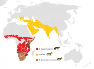 Autrefois largement présent (selon des preuves paléontologiques fossiles[22]), c'est l'une des espèces de canidés les plus répandues dans le monde, avec de vastes territoires en Europe centrale, Europe de l'Est, Afrique du Nord et dans certaines régions d'Asie[23](Birmanie, Inde)[24]. Son aire de répartition s'étend aujourd'hui rapidement en Europe de l'Ouest, occupant des zones où il n'y a plus ou très peu de loups. Cette colonisation, d'un animal déjà présent au sud-est du continent, étant naturelle et liée à une évolution de l'environnement, la Commission européenne conclut en 2016 qu'il ne doit pas être considéré comme une espèce exotique envahissante[25].