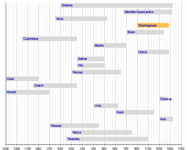 Les Chachapoyas sont un peuple andin dont le nom signifie « guerriers des nuages ». Ils sont décrits par certains chroniqueurs espagnols (Inca Garcilaso de la Vega et surtout Pedro Cieza de León) comme « grands, blonds et blancs de peau »[1]. Ils vécurent du IXe au XVe siècle sur un territoire de 65 000 km2 dans le Nord de l'actuel Pérou, à cheval sur les départements de San Martín et d'Amazonas.