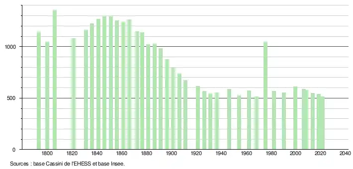 L'évolution du nombre d'habitants est connue à travers les recensements de la population effectués dans la commune depuis 1793. Pour les communes de moins de 10 000 habitants, une enquête de recensement portant sur toute la population est réalisée tous les cinq ans, les populations légales des années intermédiaires étant quant à elles estimées par interpolation ou extrapolation[23]. Pour la commune, le premier recensement exhaustif entrant dans le cadre du nouveau dispositif a été réalisé en 2008[24].
