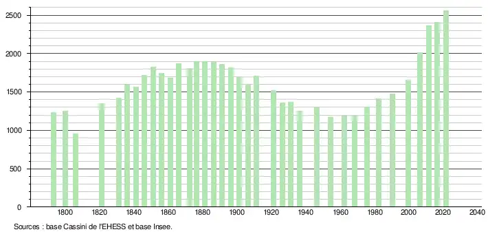 L'évolution du nombre d'habitants est connue à travers les recensements de la population effectués dans la commune depuis 1793. Pour les communes de moins de 10 000 habitants, une enquête de recensement portant sur toute la population est réalisée tous les cinq ans, les populations légales des années intermédiaires étant quant à elles estimées par interpolation ou extrapolation[30]. Pour la commune, le premier recensement exhaustif entrant dans le cadre du nouveau dispositif a été réalisé en 2006[31].