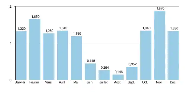 Sur période d'observation, le débit journalier maximal a été observé le pour 5,27 m3/s. Le débit instantané maximal a été observé le [note 2] avec 32,80 m3/s en même temps que la hauteur maximale instantanée de 173 cm soit 1,73 m. Le débit journalier maximal a été atteint le pour 26,30 m3/s[2].