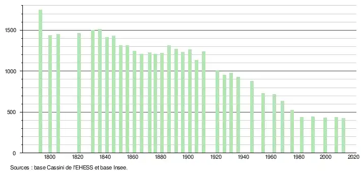 L'évolution du nombre d'habitants est connue à travers les recensements de la population effectués dans la commune depuis 1793. À partir du , les populations légales des communes sont publiées annuellement dans le cadre d'un recensement qui repose désormais sur une collecte d'information annuelle, concernant successivement tous les territoires communaux au cours d'une période de cinq ans. Pour les communes de moins de 10 000 habitants, une enquête de recensement portant sur toute la population est réalisée tous les cinq ans, les populations légales des années intermédiaires étant quant à elles estimées par interpolation ou extrapolation[6]. Pour la commune, le premier recensement exhaustif entrant dans le cadre du nouveau dispositif a été réalisé en 2007[7],[Note 1].