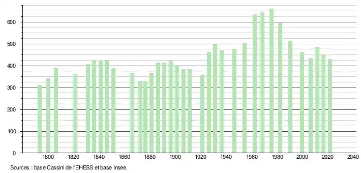 L'évolution du nombre d'habitants est connue à travers les recensements de la population effectués dans la commune depuis 1793. Pour les communes de moins de 10 000 habitants, une enquête de recensement portant sur toute la population est réalisée tous les cinq ans, les populations légales des années intermédiaires étant quant à elles estimées par interpolation ou extrapolation[20]. Pour la commune, le premier recensement exhaustif entrant dans le cadre du nouveau dispositif a été réalisé en 2006[21].