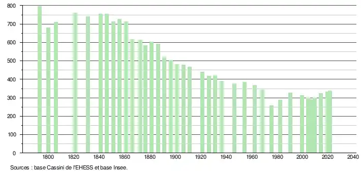 L'évolution du nombre d'habitants est connue à travers les recensements de la population effectués dans la commune depuis 1793. Pour les communes de moins de 10 000 habitants, une enquête de recensement portant sur toute la population est réalisée tous les cinq ans, les populations légales des années intermédiaires étant quant à elles estimées par interpolation ou extrapolation[28]. Pour la commune, le premier recensement exhaustif entrant dans le cadre du nouveau dispositif a été réalisé en 2004[29].