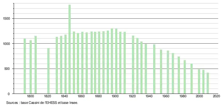 L'évolution du nombre d'habitants est connue à travers les recensements de la population effectués dans la commune depuis 1793. À partir du , les populations légales des communes sont publiées annuellement dans le cadre d'un recensement qui repose désormais sur une collecte d'information annuelle, concernant successivement tous les territoires communaux au cours d'une période de cinq ans. Pour les communes de moins de 10 000 habitants, une enquête de recensement portant sur toute la population est réalisée tous les cinq ans, les populations légales des années intermédiaires étant quant à elles estimées par interpolation ou extrapolation[15]. Pour la commune, le premier recensement exhaustif entrant dans le cadre du nouveau dispositif a été réalisé en 2004[16],[Note 1].