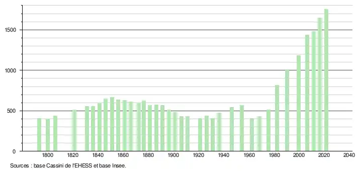 L'évolution du nombre d'habitants est connue à travers les recensements de la population effectués dans la commune depuis 1793. Pour les communes de moins de 10 000 habitants, une enquête de recensement portant sur toute la population est réalisée tous les cinq ans, les populations légales des années intermédiaires étant quant à elles estimées par interpolation ou extrapolation[23]. Pour la commune, le premier recensement exhaustif entrant dans le cadre du nouveau dispositif a été réalisé en 2006[24].