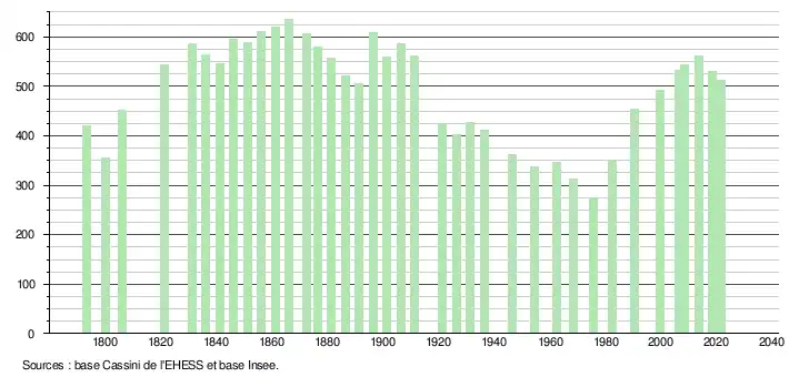 L'évolution du nombre d'habitants est connue à travers les recensements de la population effectués dans la commune depuis 1793. Pour les communes de moins de 10 000 habitants, une enquête de recensement portant sur toute la population est réalisée tous les cinq ans, les populations légales des années intermédiaires étant quant à elles estimées par interpolation ou extrapolation[20]. Pour la commune, le premier recensement exhaustif entrant dans le cadre du nouveau dispositif a été réalisé en 2008[21].