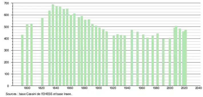 L'évolution du nombre d'habitants est connue à travers les recensements de la population effectués dans la commune depuis 1793. Pour les communes de moins de 10 000 habitants, une enquête de recensement portant sur toute la population est réalisée tous les cinq ans, les populations légales des années intermédiaires étant quant à elles estimées par interpolation ou extrapolation[13]. Pour la commune, le premier recensement exhaustif entrant dans le cadre du nouveau dispositif a été réalisé en 2008[14].