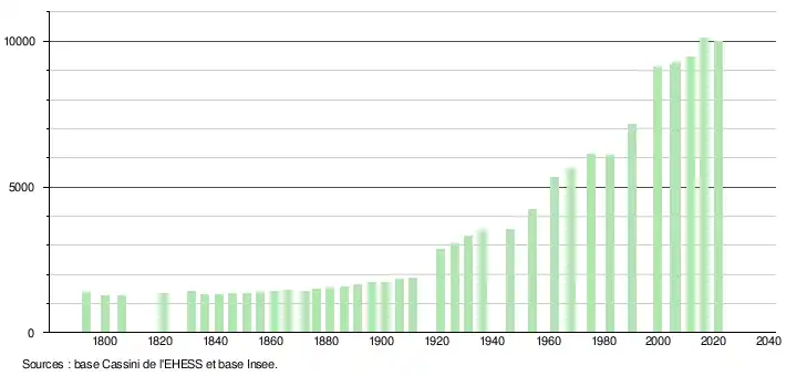 - Par convention dans Wikipédia, le principe a été retenu de n’afficher dans le tableau des recensements et le graphique, pour les populations légales postérieures à 1999, que les populations correspondant à une enquête exhaustive de recensement pour les communes de moins de 10 000 habitants, et que les populations des années 2006, 2011, 2016, etc. pour les communes de plus de 10 000 habitants, ainsi que la dernière population légale publiée par l’Insee pour l'ensemble des communes.