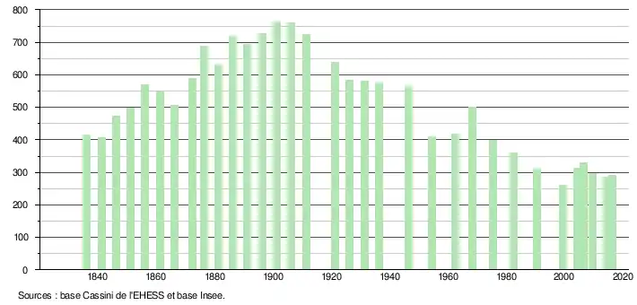 L'évolution du nombre d'habitants est connue à travers les recensements de la population effectués dans la commune depuis 1836. Pour les communes de moins de 10 000 habitants, une enquête de recensement portant sur toute la population est réalisée tous les cinq ans, les populations légales des années intermédiaires étant quant à elles estimées par interpolation ou extrapolation[5]. Pour la commune, le premier recensement exhaustif entrant dans le cadre du nouveau dispositif a été réalisé en 2004[6].
