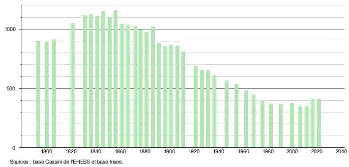 L'évolution du nombre d'habitants est connue à travers les recensements de la population effectués dans la commune depuis 1793. Pour les communes de moins de 10 000 habitants, une enquête de recensement portant sur toute la population est réalisée tous les cinq ans, les populations légales des années intermédiaires étant quant à elles estimées par interpolation ou extrapolation[27]. Pour la commune, le premier recensement exhaustif entrant dans le cadre du nouveau dispositif a été réalisé en 2006[28].