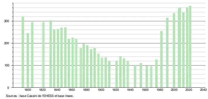 L'évolution du nombre d'habitants est connue à travers les recensements de la population effectués dans la commune depuis 1793. Pour les communes de moins de 10 000 habitants, une enquête de recensement portant sur toute la population est réalisée tous les cinq ans, les populations légales des années intermédiaires étant quant à elles estimées par interpolation ou extrapolation[21]. Pour la commune, le premier recensement exhaustif entrant dans le cadre du nouveau dispositif a été réalisé en 2007[22].