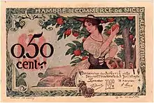 Entre 1917 et 1922, la chambre de commerce de Nice et des Alpes-Maritimes émet, à l'instar de nombreuses chambres consulaires françaises, dix-huit millions de jetons métalliques et bons de monnaie, destinés à suppléer au manque de petite monnaie causé par la thésaurisation et le trafic des métaux dus à la guerre[3].