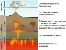 Dans une zone diapirique, le magma primaire remonte vers la surface. Vers 60–50 km de profondeur, le niveau structural devient dur et cassant, favorisant la formation d'un réseau de fractures dans lequel s'injecte ce magma. « Dans la majorité des cas, l'ascension s'arrête en cours de route pour des raisons diverses (modification tectonique ou thermique locale, variation du taux de production magmatique, augmentation de la densité relative magma/encaissant qui limite la « poussée d'Archimède »). Cet arrêt a souvent lieu à la limite entre le manteau et la croûte (30 km de profondeur environ) ou bien au sein même de celle-ci (entre 30 et 10 km). Après un laps de temps donné (quelques siècles ou millénaires), les fractures s'anastomosent. Une poche, remplie de magma, se forme puis s'agrandit par effondrements », formant ainsi une chambre magmatique[6] (modèle classique).