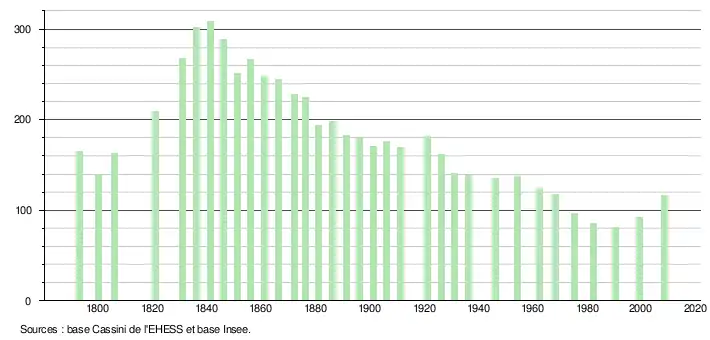 L'évolution du nombre d'habitants est connue à travers les recensements de la population effectués dans la commune depuis 1793. À partir du , les populations légales des communes sont publiées annuellement dans le cadre d'un recensement qui repose désormais sur une collecte d'information annuelle, concernant successivement tous les territoires communaux au cours d'une période de cinq ans. Pour les communes de moins de 10 000 habitants, une enquête de recensement portant sur toute la population est réalisée tous les cinq ans, les populations légales des années intermédiaires étant quant à elles estimées par interpolation ou extrapolation[6]. Pour la commune, le premier recensement exhaustif entrant dans le cadre du nouveau dispositif a été réalisé en 2008[7],[Note 1].