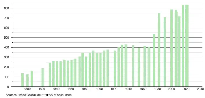 L'évolution du nombre d'habitants est connue à travers les recensements de la population effectués dans la commune depuis 1793. Pour les communes de moins de 10 000 habitants, une enquête de recensement portant sur toute la population est réalisée tous les cinq ans, les populations légales des années intermédiaires étant quant à elles estimées par interpolation ou extrapolation[26]. Pour la commune, le premier recensement exhaustif entrant dans le cadre du nouveau dispositif a été réalisé en 2005[27].