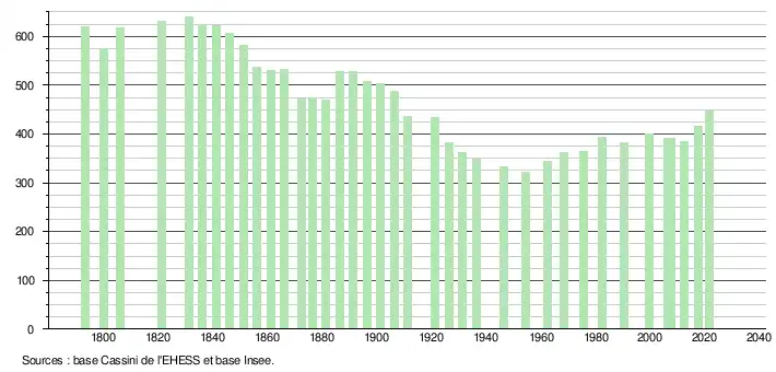 L'évolution du nombre d'habitants est connue à travers les recensements de la population effectués dans la commune depuis 1793. Pour les communes de moins de 10 000 habitants, une enquête de recensement portant sur toute la population est réalisée tous les cinq ans, les populations légales des années intermédiaires étant quant à elles estimées par interpolation ou extrapolation[27]. Pour la commune, le premier recensement exhaustif entrant dans le cadre du nouveau dispositif a été réalisé en 2007[28].