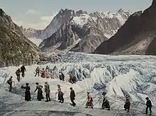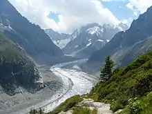 Le chemin de fer du Montenvers permet d'accéder au site touristique du Montenvers. Inauguré sur l'intégralité de son parcours le 29 mai 1909, il possède sa propre gare à proximité immédiate de la gare SNCF de Chamonix-Mont-Blanc. Les deux gares sont directement reliées par une passerelle[37]. Du Montenvers qui dispose de l'autre gare terminus, on jouit d'une vue imprenable sur la Mer de Glace, l'aiguille du Petit Dru, les Grandes Jorasses et l'aiguille des Grands Charmoz[38]. Le Montenvers est le point de départ de randonnées en moyenne montagne (jonction avec le Plan de l'Aiguille par le Grand Balcon Nord, divers itinéraires pour rejoindre la vallée) et en haute montagne (refuges de la Charpoua, du Couvercle, de Leschaux, de l'Envers des Aiguilles, du Requin)[38].