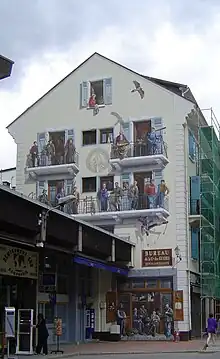 Compte tenu de la situation très encaissée du fond de la vallée, les villages se sont installés de façon à rentabiliser les terres cultivables et les pâturages, tout en cherchant à rester à l'abri des avalanches et des inondations. C'est pourquoi les maisons sont groupées[25], voire contiguës, le long des rues et ruelles, de manière à faciliter la survie en autarcie qui caractérisa cette vallée pendant des siècles. Aujourd'hui, c'est l'ensemble de ces villages ou hameaux qui donne son importance à la commune, chacun de ces villages y contribuant : le Tour avec son domaine skiable, le domaine de Balme ; Montroc avec son village constitué de maisons anciennes en pierre ; Argentière et les Chosalets au pied du domaine skiable des Grands Montets[26] ; les Pélerins, village natal de Jacques Balmat, abrite aujourd'hui le tiers de la population chamoniarde, regroupée en HLM ; les Gaillands, village célèbre pour son rocher d'escalade[27] ouvert aux varappeurs et pour son lac dans lequel se reflète la chaîne du Mont-Blanc ; les Bossons et son tremplin de saut à ski installé en bas du glacier.