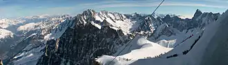 Chamonix possède l'un des téléphériques les plus hauts du monde : le téléphérique de l'Aiguille du Midi qui relie, en deux tronçons, la ville au Plan de l'Aiguille puis du Plan de l'Aiguille à l'aiguille du Midi à 3 777 mètres d'où l'on peut gagner le sommet piton central (3 842 mètres) via un ascenseur percé dans la roche[39]. De cette aiguille, on peut embarquer à 3 778 mètres à bord de la télécabine Panoramic Mont-Blanc, anciennement appelée télécabine de la Vallée Blanche, pour rejoindre la pointe Helbronner, située dans le massif du Mont-Blanc à la frontière franco-italienne à 3 466 mètres. Ce téléphérique permet d'effectuer un parcours aérien de 5 093 mètres, en à peu près 30 à 35 minutes, au-dessus de la Vallée Blanche et du glacier du Géant.