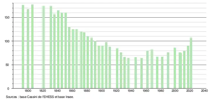 L'évolution du nombre d'habitants est connue à travers les recensements de la population effectués dans la commune depuis 1793. Pour les communes de moins de 10 000 habitants, une enquête de recensement portant sur toute la population est réalisée tous les cinq ans, les populations légales des années intermédiaires étant quant à elles estimées par interpolation ou extrapolation[14]. Pour la commune, le premier recensement exhaustif entrant dans le cadre du nouveau dispositif a été réalisé en 2007[15].