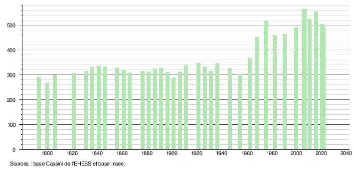 L'évolution du nombre d'habitants est connue à travers les recensements de la population effectués dans la commune depuis 1793. Pour les communes de moins de 10 000 habitants, une enquête de recensement portant sur toute la population est réalisée tous les cinq ans, les populations légales des années intermédiaires étant quant à elles estimées par interpolation ou extrapolation[26]. Pour la commune, le premier recensement exhaustif entrant dans le cadre du nouveau dispositif a été réalisé en 2005[27].