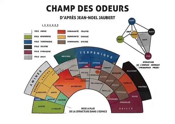 Ainsi, le champ des odeurs, élaboré en 1983, (v1) fournit, entre autres, une méthodologie qui permet de décrire les perceptions olfactives de manière commune, c'est-à-dire en écartant, au maximum, les évocations individuelles. Il a été créé par un chercheur à partir des résultats d'un programme de recherche sur la relation structure chimique / activité odorante de molécules présentes dans le monde odorant[3], conduit entre 1977 et 1983 au sein d'une équipe du CNRS (URA 401)[4]. Sa dénomination a été inspirée du "champ des étoiles" que regarde Ruth dans "Booz endormi" du recueil La Légende des siècles, de Victor Hugo.