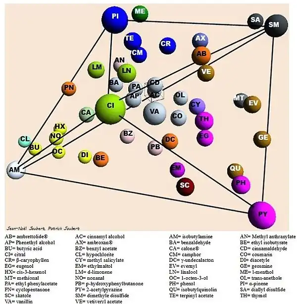 Si la recherche de relations entre la structure chimique des molécules et leur caractère odorant sait assez facilement trouver des caractéristiques chimiques bien définies, elle avait toujours buté sur le caractère odorant dont la seule connaissance passait nécessairement par l'expression de tel ou tel sujet (ou groupe de sujets) sous forme de mots traduisant l'évocation de souvenirs associés, suscitées par sa perception[7]. Le travail effectué sur 1.396 molécules odorantes par Analyse des données (notamment analyse factorielle des correspondances) a permis de retrouver une organisation dont l'essentiel de la variance du système se retrouve sur les six premiers axes[8] qui, pour des raisons évidentes de commodité, ont du être ramenés aux trois axes ci-dessous[9]. (v4)