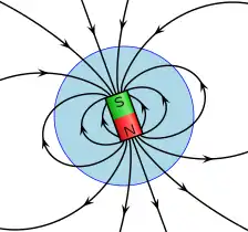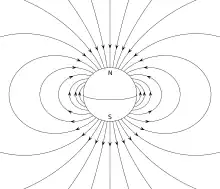 Le champ magnétique terrestre peut être comparé, en première approximation, à celui d'un aimant droit (ou d'un dipôle magnétique, ou d'une bobine plate parcourue par un courant électrique), de moment magnétique[12] 7,7 × 1022 A m2 en 2000. Le point central de cet aimant n'est pas exactement au centre de la Terre, il se trouve à quelques centaines de kilomètres du centre géométrique. Cette approximation ne doit pas faire oublier que le champ a des composantes multipolaires dont l'intensité, bien que beaucoup plus faible que la composante dipolaire, n'est pas négligeable, notamment lors d'une inversion du champ magnétique terrestre qui voit l'affaiblissement de l'intensité du dipôle si bien que les composantes non dipolaires deviennent prédominantes[13].