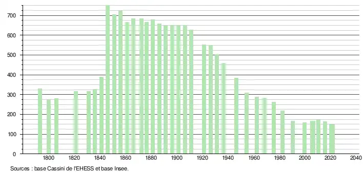 L'évolution du nombre d'habitants est connue à travers les recensements de la population effectués dans la commune depuis 1793. Pour les communes de moins de 10 000 habitants, une enquête de recensement portant sur toute la population est réalisée tous les cinq ans, les populations légales des années intermédiaires étant quant à elles estimées par interpolation ou extrapolation[22]. Pour la commune, le premier recensement exhaustif entrant dans le cadre du nouveau dispositif a été réalisé en 2005[23].
