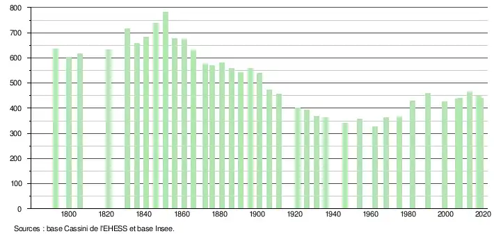 L'évolution du nombre d'habitants est connue à travers les recensements de la population effectués dans la commune depuis 1793. Pour les communes de moins de 10 000 habitants, une enquête de recensement portant sur toute la population est réalisée tous les cinq ans, les populations légales des années intermédiaires étant quant à elles estimées par interpolation ou extrapolation[2]. Pour la commune, le premier recensement exhaustif entrant dans le cadre du nouveau dispositif a été réalisé en 2007[3].
