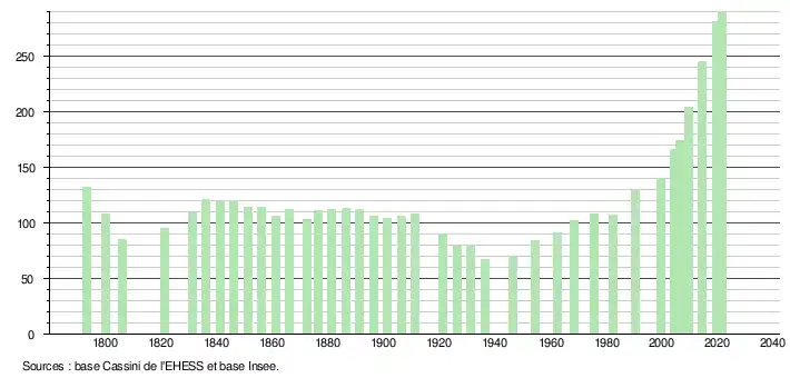 L'évolution du nombre d'habitants est connue à travers les recensements de la population effectués dans la commune depuis 1793. Pour les communes de moins de 10 000 habitants, une enquête de recensement portant sur toute la population est réalisée tous les cinq ans, les populations légales des années intermédiaires étant quant à elles estimées par interpolation ou extrapolation[18]. Pour la commune, le premier recensement exhaustif entrant dans le cadre du nouveau dispositif a été réalisé en 2004[19].