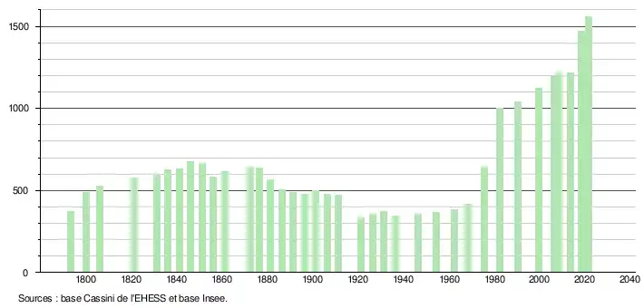 L'évolution du nombre d'habitants est connue à travers les recensements de la population effectués dans la commune depuis 1793. Pour les communes de moins de 10 000 habitants, une enquête de recensement portant sur toute la population est réalisée tous les cinq ans, les populations légales des années intermédiaires étant quant à elles estimées par interpolation ou extrapolation[27]. Pour la commune, le premier recensement exhaustif entrant dans le cadre du nouveau dispositif a été réalisé en 2008[28].