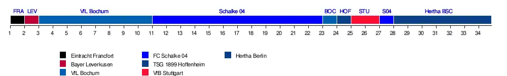 | Schalke 04 | 14 | 13 | 13 | 16 | 15 | 12 | 14 | 15 | 16 | 17 | 18 | 18 | 18 | 18 | 18 | 18 | 18 | 18 | 18 | 18 | 18 | 18 | 17 | 17 | 17 | 17 | 18 | 17 | 17 | 17 | 15 | 16 | 17 | 17 | 3 | 21 | |