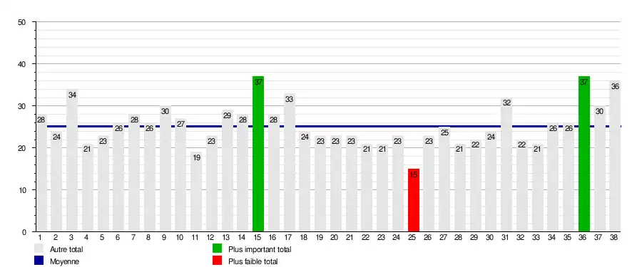 | Journée → | 1 | 2 | 3 | 4 | 5 | 6 | 7 | 8 | 9 | 10 | 11 | 12 | 13 | 14 | 15 | 16 | 17 | 18 | 19 | 20 | 21 | 22 | 23 | 24 | 25 | 26 | 27 | 28 | 29 | 30 | 31 | 32 | 33 | 34 | 35 | 36 | 37 | 38 |
