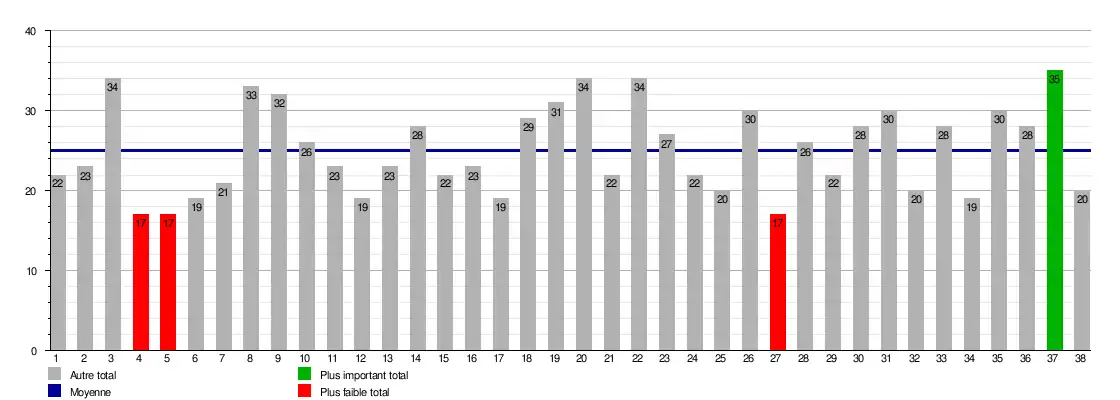 | Journée → | 1 [r 1],[e 1] | 2 [r 1],[e 2] | 3 | 4 [r 2] | 5 | 6 | 7 | 8 | 9 | 10 | 11 | 12 | 13 | 14 | 15 | 16 | 17 | 18 [r 3] | 19 [a 1] | 20 | 21 | 22 | 23 | 24 | 25 | 26 | 27 | 28 | 29 | 30 | 31 [a 2] | 32 | 33 | 34 | 35 | 36 | 37 | 38 | Journées en tête | Journées relégable |
