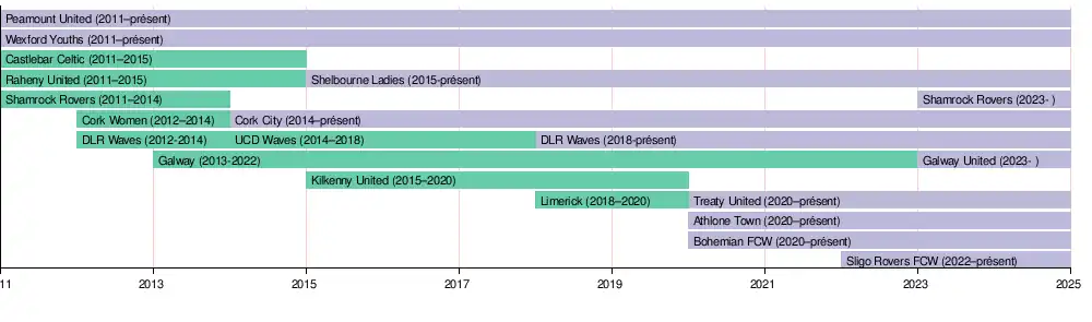 Le DLR Waves Football Club rejoint le championnat pour la saison 2012-2013 et le Galway Women Football Club la saison suivante. Au commencement de la saison 2014-2014 le club de Cork devient la section féminine du Cork City Football Club et change de nom. Au même moment est annoncé la fusion entre le DLR et l'UCD avec là aussi un changement de dénomination (UCD Waves). De son côté le Shamrock Rovers Ladies Football Club abandonne le football de haut niveau. En janvier 2015, la FAI annonce sa volonté d'élargir le championnat. Kilkenny United Women's Football Club intègre donc la compétition. Au cours de la saison 2015, le Raheny United Football Club fusionne avec le Shelbourne FC pour devenir le Shelbourne Ladies Football Club. Au cours de la saison 2015-2016 le Castlebar Celtic Women's football Club déclare forfait après neuf journée car il n'est plus capable de rassembler une équipe en nombre suffisant. Le Limerick Women's Football Club rejoint le championnat pour la saison 2018. Le championnat se dispute à partir de cette date avec huit équipes. Pour sa dixième saison, le championnat accueille un nouveau participant, la section féminine de l'Athlone Town Football Club[8]. Le club qui concourait depuis deux saisons dans le championnat d'Irlande des moins de 17 ans se lance dans la catégorie Senior[9]. La saison 2020 connait d'autres changement majeurs : Kilkenny United Women's Football Club voit sa licence annulée pour des raisons administratives et sportives. l'équipe quitte donc le championnat après cinq saisons. le Bohemian FC intègre la compétition[10]. Le championnat passe donc à neuf équipes.