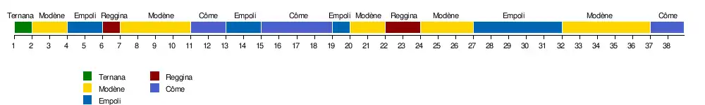 | Modène FC | 0-0 | 2-0 | 3-0 | 4-2 | 3-0 | 1-1 | 2-0 | 0-1 | 0-0 | 1-1 | 4-1 | 2-0 | 1-0 | 3-1 | 5-2 | 2-0 | 2-2 | 2-0 | 0-1 | |
