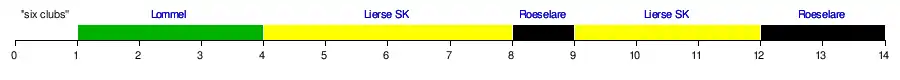 | 7 | Lommel United | 13 | 14 | 7 | -7 |