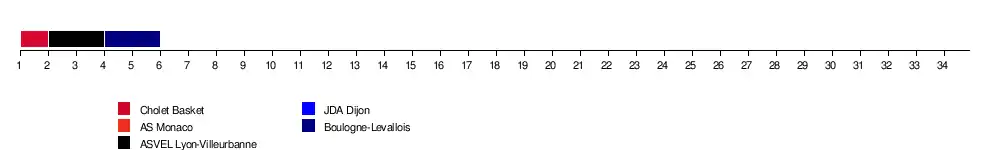 | Limoges | 109-104 | 54-59 | 76-75 | 79-91 | 82-57 | 75-67 | 100-48 | 82-75 | 77-64 | 70-79 | 88-89 | 65-77 | 83-63 | 93-76 | 85-75 | 86-61 | 89-62 | |