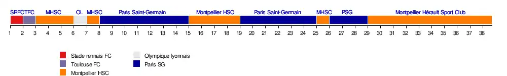 Le championnat s'achève le sur le sacre du Montpellier HSC pour la première fois de son histoire. C'est le premier vainqueur inédit depuis Lyon en 2002. Cette saison est aussi marquée par la relégation de l'AJ Auxerre, une première pour le club depuis sa promotion en 1980.