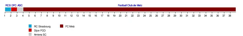 - Plus grande série de matchs sans victoire[20] : 11 matchs pour le FC Metz entre les 7e et 17e journées, le Lille OSC entre les 24e et 34e journées et le RC Strasbourg Alsace entre les 26e et 36e journées.